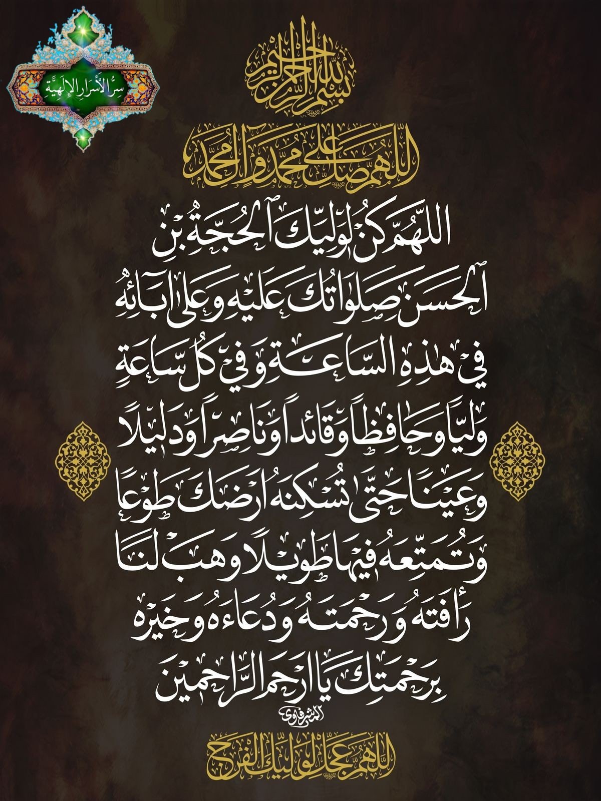 اَللّـهُمَّ كُنْ لِوَلِيِّكَ الْحُجَّةِ بْنِ الْحَسَنِ صَلَواتُكَ عَلَيْهِ وَعَلى آبائِه في هذِهِ السَّاعَةِ وَفي كُلِّ ساعَة وَلِيّاً وَحافِظاً وَقائِداً وَناصِراً وَدَليلاً وَعَيْنا حَتّى تُسْكِنَهُ اَرْضَكَ طَوْعاً وَتُمَتِّعَهُ فيها طَويلاً .. برحمتك يا أرحم الراحمين ....